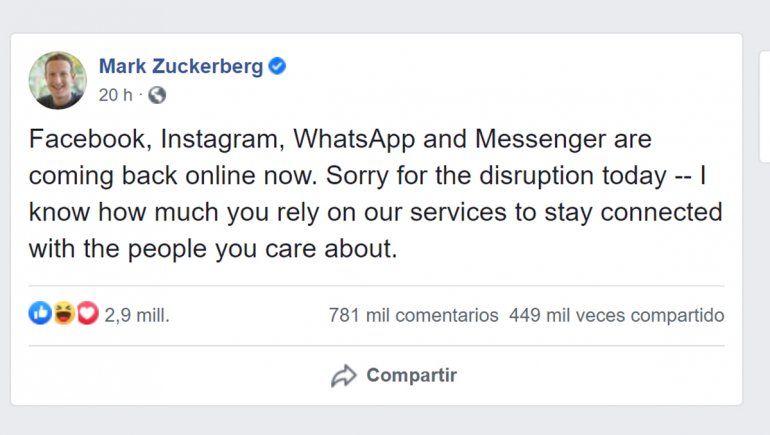 Según estimaciones, la interrupción podría haber hecho desaparecer mas de 6000 millones de dólares del patrimonio personal de Zuckerberg, y sus acciones cayeron casi un 5%.