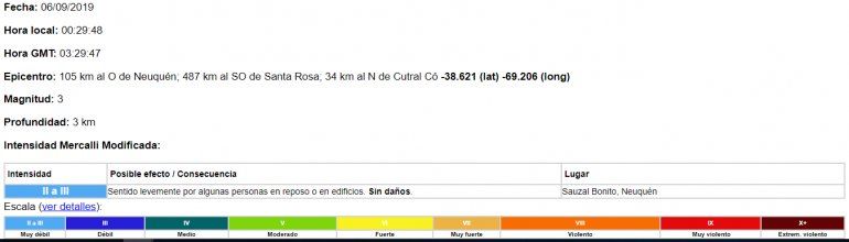 Este viernes a las 0.29 se registró un movimiento sísmico con epicentro a 105 kilómetros al oeste de Neuquén, a una profundidad de 3 kilómetros y una magnitud de 3, de acuerdo al reporte del Inpres. Este fenómeno fue catalogado como débil por lo que no se registraron daños en la localidad del interior neuquino.