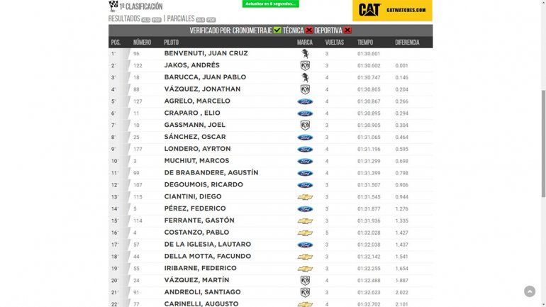 El cuarto lugar correspondió a Jonathan Vázquez y la quinta posición fue para Marcelo Agrelo, en la clasificación provisoria que se conoció esta tarde.