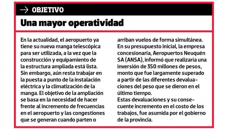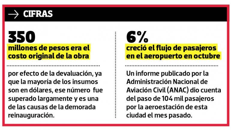 El funcionario explicó que la devaluación de la moneda local retrasó la entrega de elementos importados para la conclusión de la ampliación de la sala de embarque y otras instalaciones de la estación aérea. "Además, tenemos que hacer las pruebas para que pueda empezar a funcionar", dijo en referencia, por ejemplo, al sistema contra incendios que activa los rociadores para combatir el fuego y al que permite proveer de energía al nuevo sector del edificio.