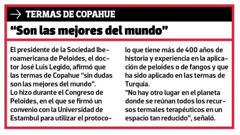 Durante el congreso, 50 científicos presentaron investigaciones realizadas en Argentina, Brasil, Colombia y España. Una de las conclusiones centrales fue que todo el tratamiento termal complementario y preventivo es efectivo. “Estamos ansiosos por los resultados que vamos a obtener luego de la aplicación del tratamiento para personas con artrosis, cumpliendo el protocolo realizado por la Universidad de Estambul, que brinda la oportunidad de que en ciudades que no tienen termas, como Neuquén, se puedan aplicar fangos o peloides del área de Copahue y quizás, en el futuro, de los centros termales emergentes”, amplió.