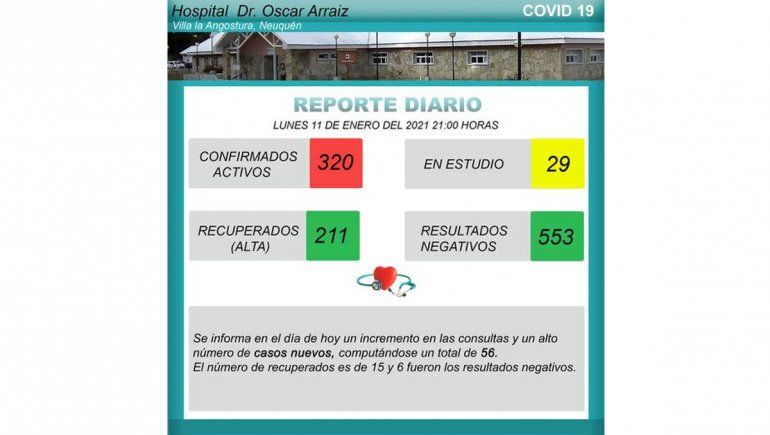 Los casos positivos de Covid alcanzaron los 320 en tanto que los que están en estudio y aguardan los resultados de los testeos son 29. Además, desde el hospital local anunciaron que fueron 15 las personas recuperadas y seis los que resultaron negativos. Desde el inicio de la pandemia, en Villa La Angostura los que recibieron el alta son 211 y 553 los que resultaron negativos.