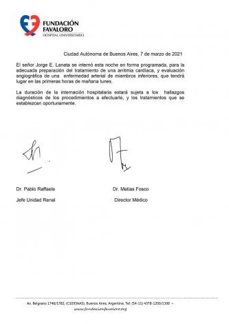 "El señor Jorge E. Lanata se internó esta noche en forma programada, para la adecuada preparación del tratamiento de una arritmia cardíaca, y evaluación angiográfica de una enfermedad arterial de miembros inferiores, que tendrá lugar en las primeras horas de mañana lunes. La duración de la internación hospitalaria estará sujeta a los hallazgos diagnósticos de los procedimientos a efectuarle, y los tratamientos que se establezcan oportunamente”, explicaron en un comunicado desde la institución médica.