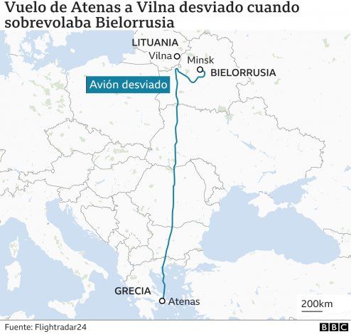 La cadena Nexta dijo que el periodista y su ex editor fue detenido cuando el avión aterrizó en Minsk, la capital de Bielorrusia. Los medios estatales de Bielorrusia dijeron que el avión fue desviado por una amenaza de bomba pero que no se encontraron explosivos.