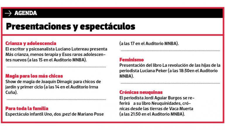 Las temáticas de la infancia y la adolescencia estarán focalizadas en la presentación del psicoanalista Luciano Lutereau, autor de Más crianza y menos terapia y Esos raros adolescentes nuevos. En tanto, a las 20:30, la escritora Claudia Piñeiro presentará su libro de cuentos Quién no.