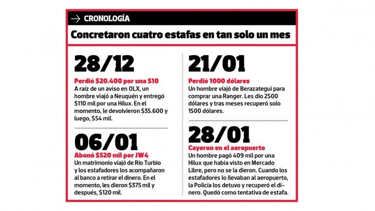 En todos los casos, las víctimas se contactaron a un número de teléfono que aparecía en una publicación en portales de internet para comprar una camioneta.