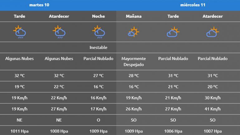 Para el miércoles, la mínima alcanzará los 14°C y la máxima será de 31°C. El cielo estará “parcialmente nublado” y las ráfagas de viento promediarán los 44 km/h, en horas de la noche.