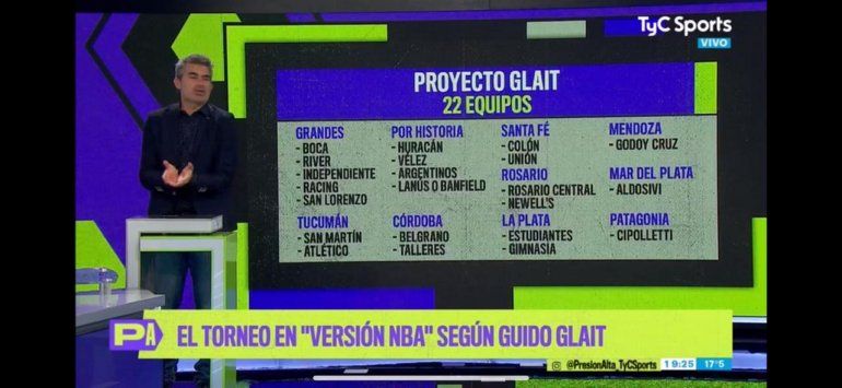 Lo que se denomina como "Proyecto Glait" se compone de 22 equipos. Y se agrupan bajo distintas clasificaciones o regiones. Así está los cinco grandes (Boca, River, San Lorenzo, Independiente y Racing), otros cuatro "Por Historia" con una duda: Huracán, Vélez, Argentinos, Lanús ó Banfield; los dos rosarinos (Central y Newell's), los dos platenses (Estudiantes y Gimnasia), los cordobeses (Talleres y Belgrano), los tucumanos (San Martín y Atlético), los santafesinos (Colón y Unión) y le asigna una plaza a Mar del Plata (Aldosivi), otra a Mendoza (Godoy Cruz) y una a la Patagonia, que es la de Cipo.