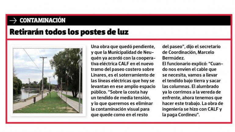 La Municipalidad de Neuquén tiene casi terminado un proyecto que prevé la extensión del paseo costero sobre el río Limay, permitiendo llegar por Linares desde el puente hasta la calle Tronador.