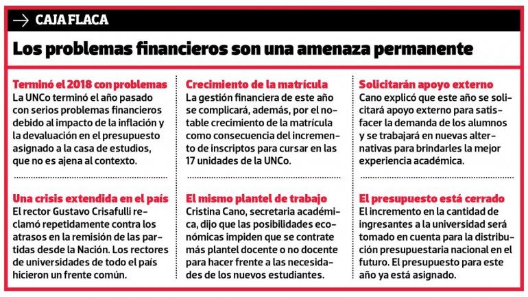 Con un crecimiento cercano al 35% en la matrícula de ingresantes, la Universidad Nacional del Comahue (UNCo) se prepara para comenzar el ciclo lectivo con una cantidad récord de estudiantes anotados. Unos 8 mil alumnos ya están inscriptos de manera definitiva en alguna de las 17 unidades académicas de la institución, pero el número puede incrementarse porque hay aspirantes que aún están a tiempo de completar la documentación para acceder a un banco.