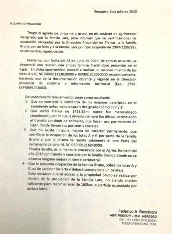 El 23 de junio, de común acuerdo, se realizó una reunión entre las dos familias para llegar a un acuerdo entre partes sobre los lotes A y G con nomenclatura catastral 09RR01313020000 y 09RR01313030000. Pero quedó en la nada y desde hace unos días hay una suerte de pelea en ese campo camino a Mari Menuco. “Hay dos papeles firmados por Gustavo Celayes y Eduardo Ferrearesso, que en su momento estaban a cargo de la dirección Tierras de la Provincia”, concluyó Lara.