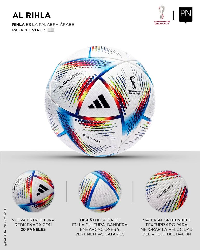 La pelota del Mundial de Qatar 2022 se llama “Al Rihla”, que en árabe significa "el viaje". El diseño está inspirado en la cultura, la arquitectura, las embarcaciones icónicas y la bandera del país organizador.