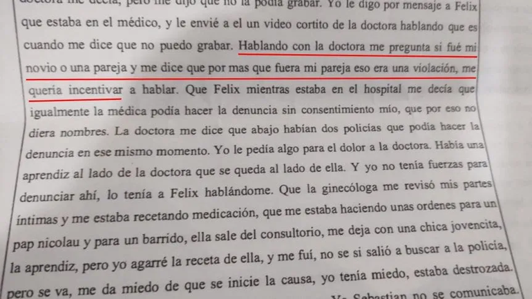 Por esto último era importante la palabra de la médica, porque en su declaración la joven había hecho mención a que la doctora le dijo que la situación encuadraba en un abuso sexual y que debía denunciarlo ante los dos policías que estaban en el hospital, y que tras recetarle analgésicos la médica salió presuntamente a buscar a esos oficiales, mientras ella se quedó con una residente y aprovechó para irse porque no estaba en ese momento en condiciones de denunciar.