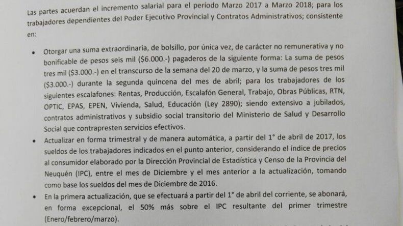 En el acta que firmaron los docentes de ATEN, hay un artículo igual al de ATE con la salvedad que, luego de la palabra “excepcional” se añadió “y por única vez”. Los maestros también acordaron cobrar otro 4% por encima de lo que indique la inflación desde abril en adelante.