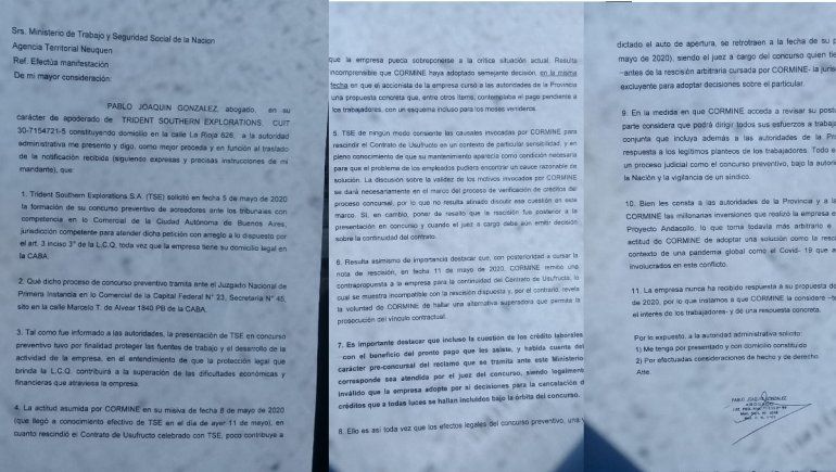 Respecto a la rescición del contrato, afirmaron que "la actitud asumida por CORMINE en su misiva de fecha 8 de mayo (que llegó a conocimiento efectivo de TSE en el dia de ayer 11 de mayo) en cuanto rescindió el Contrato de Usufructo, poco contribuye a que la empresa pueda sobreponerse a la crítica situación actual. Resulta incomprensible que CORMINE haya adoptado semejante decisión, en la misma fecha en que el accionista de la empresa cursó a las autoridades de la Provincia una propuesta concreta que, entre otros items, contemplaba el pago pendiente a los trabajadores, con un esquema incluso para los meses venideros".