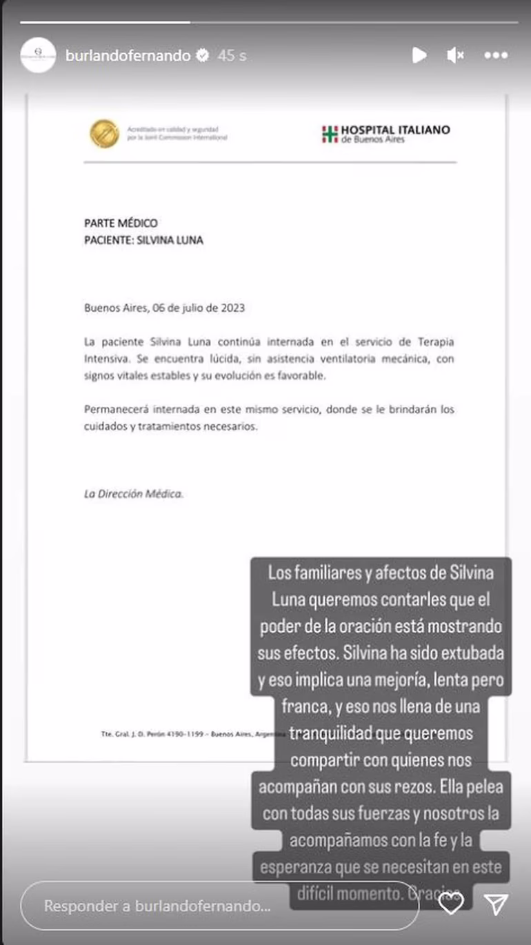 “La paciente Silvina Luna continúa internada en el servicio de Terapia Intensiva. Se encuentra lúcida, sin asistencia ventilatoria mecánica, con signos vitales estables y su evolución es favorable”, indica el informe que publicó el letrado en sus historias de Instagram.