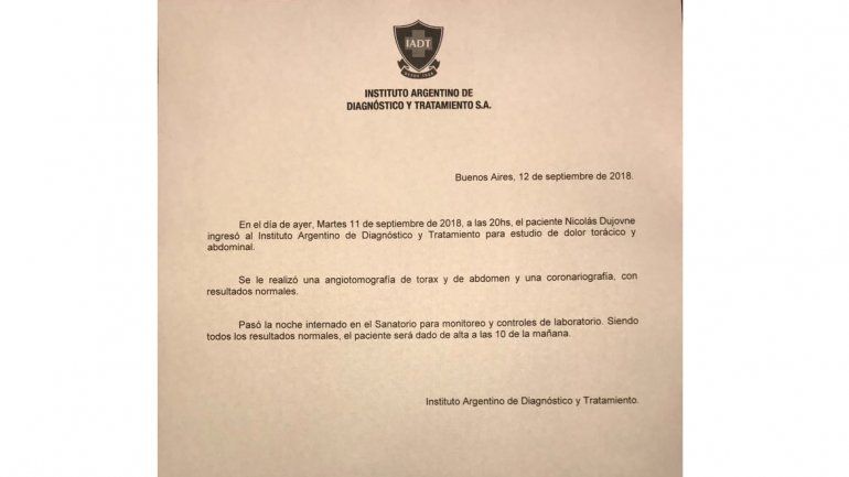 De acuerdo al parte médico del Instituto Argentino de Diagnóstico y Tratamiento (IADT), se le efectuó un estudio de angiotomografía de tórax y de abdomen como así también una coronariografía. Todos arrojaron resultados favorables.