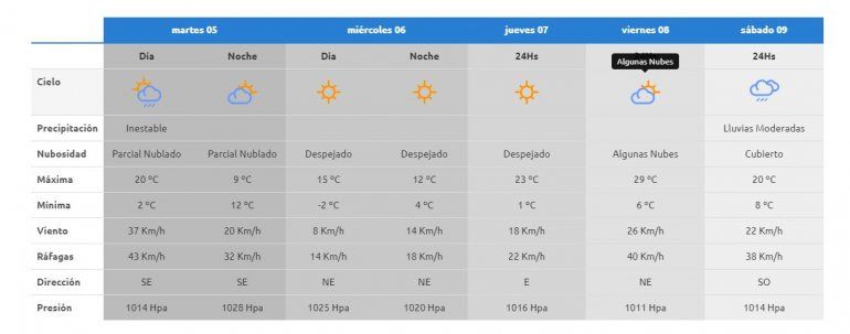 El martes está pronosticado tiempo inestable con probabilidad de lluvia. Aunque la temperatura máxima será de 20 grados y la mínima de 2 grados. Por la noche descenderá a 9 grados de máxima y 12 grado de mínima. Se prevé viento leve con ráfagas que podrían alcanzar los 43 kilómetros por hora del sector sudeste.