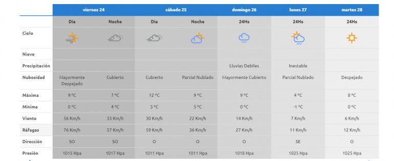 El viernes se espera una jornada con cielo despejado pero con vientos fuertes con registros términos entre los 0 grados y los 8°C, similar a lo que ocurrirá el sábado, cuando calma el viento y el sol podría tener algunas apariciones con una máxima que podría alcanzar los 12°C.