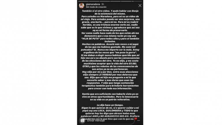 “Para ustedes es Maradona, para mí es un video de mi viejo. Para ustedes puede ser una gracia, una burla... para mí no. Para mí es reabrir heridas, es una tristeza enorme verlo así. Nadie sabe qué es lo que vivimos y agradezco que así sea porque es mi forma de preservarlo”, arrancó diciendo Gianinna.