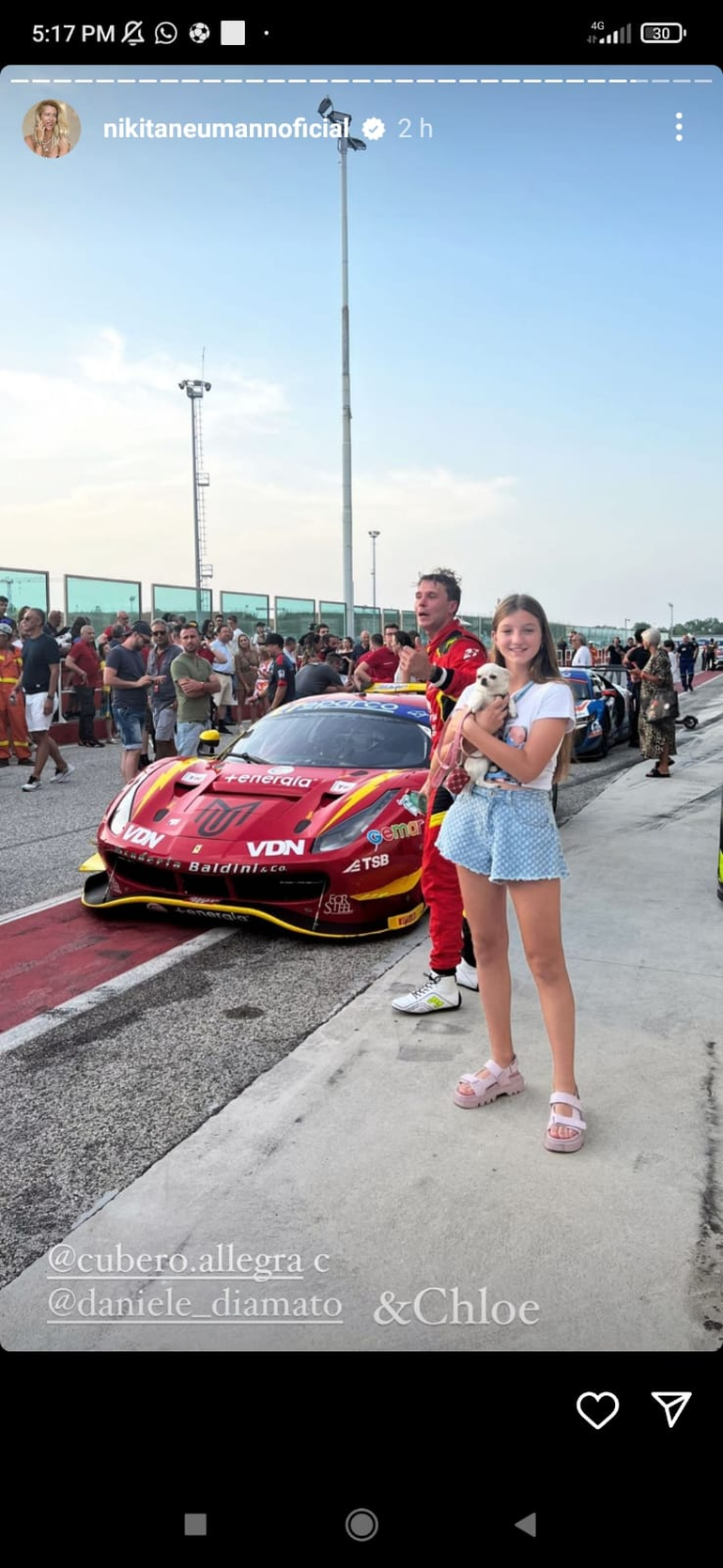 Por ejemplo, una de las chicas apareció este sábado, una vez consumado el triunfo de Manu, posando con el trofeo y también en la pista, cerca de la Ferrari del rionegrino y junto a su tierna mascota.