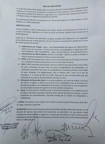 Quintriqueo comentó que se firmó un acta en la reunión, en la que obtuvieron respuesta a varios de los reclamos que llevó ATE, como el pase a planta de los trabajadores eventuales.