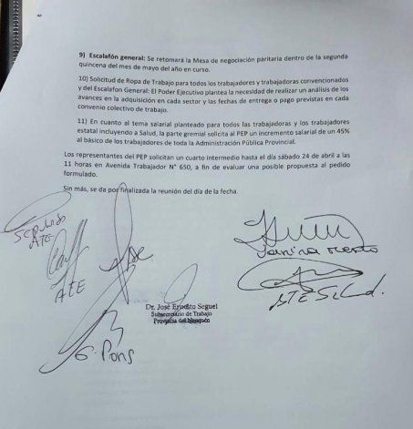En el acta de la reunión, se establece que el gobierno iniciará el proceso de incorporación de los eventuales en las distintas dependencias entre la semana que viene y la primera quincena de mayo. También quedó asentado que se analizará la situación de los monotributistas que se desempeñan en Salud, que requieren el pase a planta ante la demora de los llamados a concurso que se comprometieron con ATE.