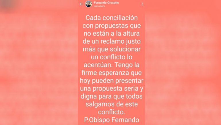 En su estado de perfil, el obispo expresó que “cada conciliación con propuestas que no están a la altura de un reclamo justo más que solucionar un conflicto lo acentúan”.