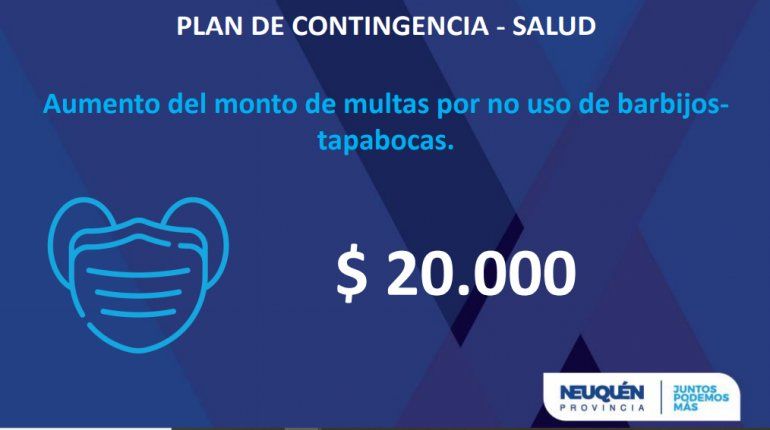 Por otro lado, todas estas medidas quedan sujetas siempre al uso obligatorio de barbijo en la vía pública, según lo dictado en el Decreto Nº 1025/20, y en caso del no cumplimiento de esta reglamentación, las personas quedarán supeditadas a multas de 20 mil pesos, cuyos fondos serán destinados a sostener la emergencia sanitaria en la provincia.