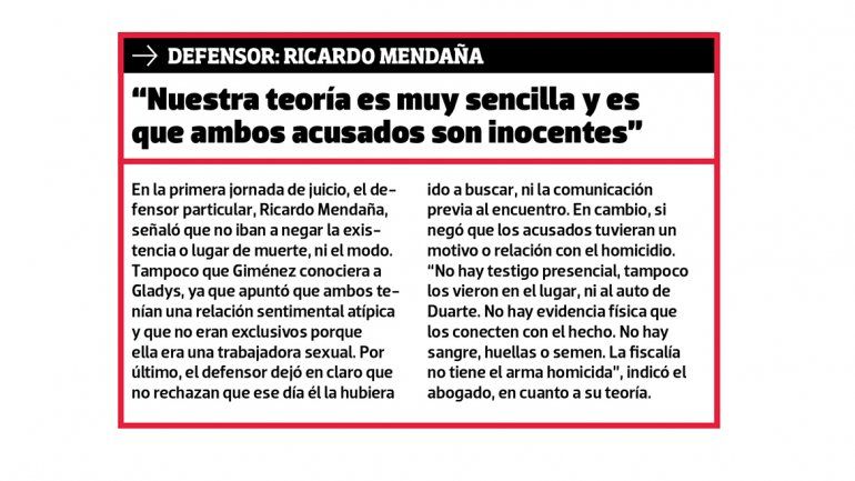 En la primera jornada de juicio, el defensor particular, Ricardo Mendaña, señaló que no iban a negar la existencia o lugar de muerte, ni el modo. Tampoco que Giménez conociera a Gladys, ya que apuntó que ambos tenían una relación sentimental atípica y que no eran exclusivos porque ella era una trabajadora sexual. Por último, el defensor dejó en claro que no rechazan que ese día él la hubiera ido a buscar, ni la comunicación previa al encuentro. En cambio, si negó que los acusados tuvieran un motivo o relación con el homicidio. “No hay testigo presencial, tampoco los vieron en el lugar, ni al auto de Duarte. No hay evidencia física que los conecten con el hecho. No hay sangre, huellas o semen. La fiscalía no tiene el arma homicida”, indicó el abogado, en cuanto a su teoría.