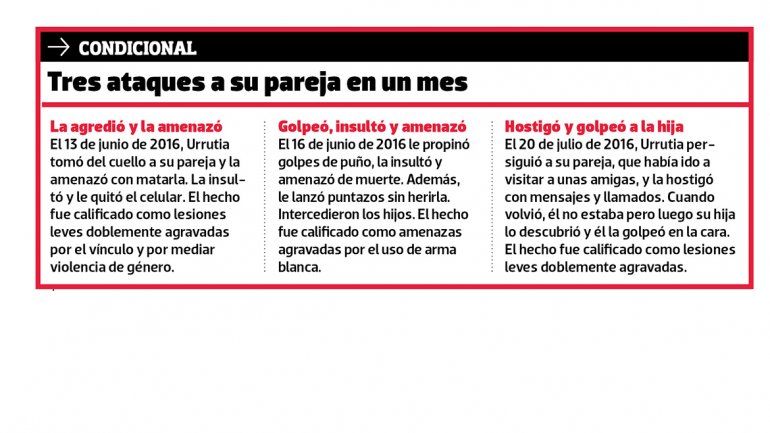 Es que por las agresiones a su entonces pareja, Urrutia acordó una pena de un año de ejecución condicional y ahora fue condenado a un año de prisión efectiva; unificadas, quedó en un año y medio de prisión efectiva.