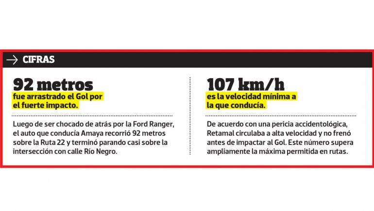 De acuerdo con la teoría de la fiscalía, Emiliano Amaya se encontraba aguardando el semáforo de Ruta 22 y Chubut en su Volkswagen Gol cuando fue impactado a una velocidad mínima de 107 kilómetros por hora por una Ford Ranger. El fuerte impacto provocó que el Gol se desviara hacia el guardarrail, se desplazara 92 metros por la calzada y quedara con la parte trasera totalmente destrozada. Inmediatamente después, el conductor de la Ranger se fugó del lugar.