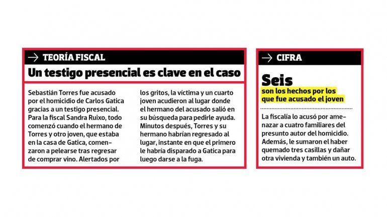 Sebastián Torres fue acusado por el homicidio de Carlos Gatica gracias a un testigo presencial. Para la fiscal Sandra Ruixo, todo comenzó cuando el hermano de Torres y otro joven, que estaba en la casa de Gatica, comenzaron a pelearse tras regresar de comprar vino. Alertados por los gritos, la víctima y un cuarto joven acudieron al lugar donde el hermano del acusado salió en su búsqueda para pedirle ayuda. Minutos después, Torres y su hermano habrían regresado al lugar, instante en que el primero le habría disparado a Gatica para luego darse a la fuga.
