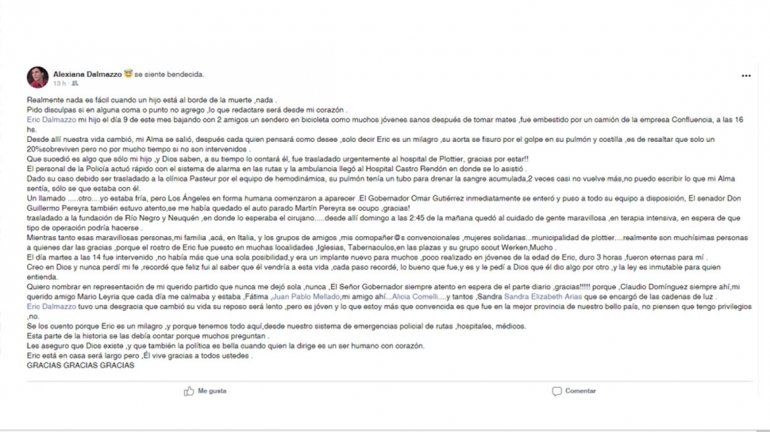 La historia detrás del mensaje comenzó el pasado domingo 9 de junio, cuando Eric casi pierde la vida, mientras disfrutaba de una travesía en bicicleta por las calles de Plottier con un grupo de amigos. Es que, en medio del paseo, un camión que circulaba a gran velocidad embistió al joven que terminó internado en la Fundación Médica de Río Negro y Neuquén, tras ser trasladado al hospital local, el Castro Rendón y la Clínica Pasteur, en menos de 48 horas.