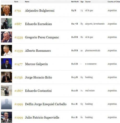 El empresario farmacéutico Alberto Roemmers está en el puesto 1339 con u$s 1800 millones, Marcos Galperin en el 1477 con u$s 1600 millones, Jorge Horacio Brito en el 1756 con u$s 1300 millones, Eduardo Costantini en el 1867 con u$s 1200 millones, Delfin Jorge Ezequiel Carballo en el 1999 con u$s 1100 millones y Julio Patricio Supervielle también en el puesto 1999 u$s 1100 millones.