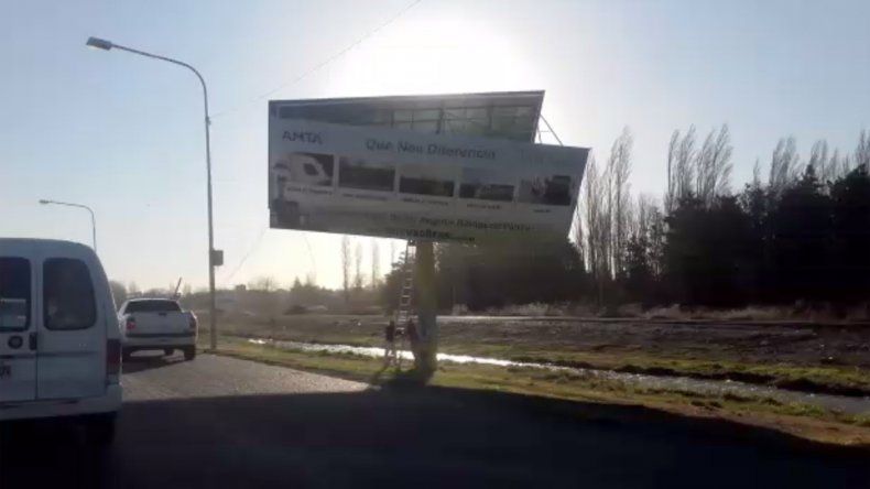 En cuanto al cartel publicitario, operarios lo amarraron con cables para restablecerlo.