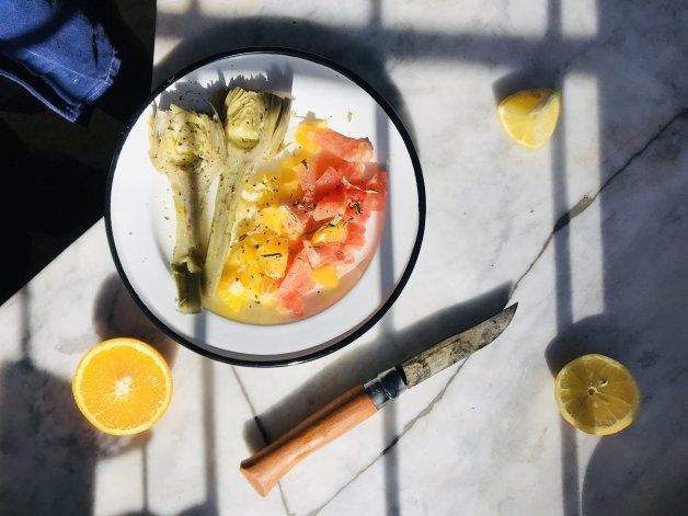 Retiramos los alcauciles y los colocamos en un plato con la criolla de cítricos. Agregamos por encima la vinagreta y algunas hojitas de burrito. Alineamos sal y pimienta de ser necesario y a disfrutar.