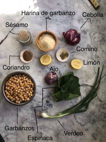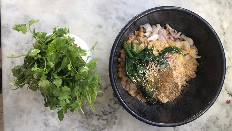 Procesar los garbanzos escurridos y crudos con mixer junto a la harina de garbanzos, la media cebolla y el ajo. La idea es lograr una pasta con textura similar a la del trigo burgol. Agregamos el cilantro, perejil, espinaca, comino, coriandro, sésamo y el aceite de oliva. Procesar diez segundos más.