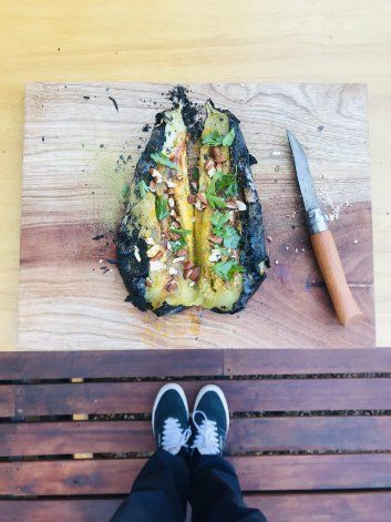 Mientras el fuego iba devorando la leña, cociné unos choclos en manteca, una berenjena ahumada con especias y armé una ensalada con tomates orgánicos de la zona.