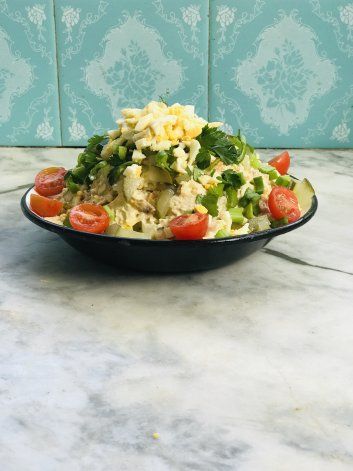 Agregamos algunas hojas de perejil, el huevo picado por encima y algunas mitades de tomates cherris. Un chorrito de oliva y ¡a disfrutar!