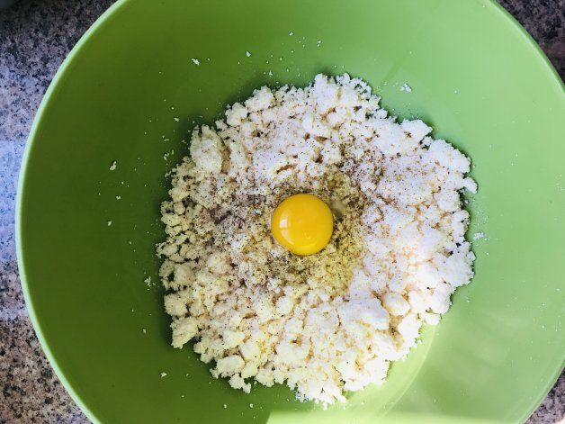 En un recipiente o bowl meter la ricota (hay que intentar que no tenga mucho líquido, sino lo secan con un paño), sumarle el huevo, sal, pimienta y el queso rallado. Unir bien aplastando (yo lo hice con pisapapa, pero con tenedor va muy bien)