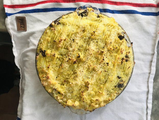 Pastel de papa y batata. Un mix ideal, un puré superpoderoso condimentado y ensamblado a una falda que se cocina lenta con un sofrito básico y un vasito de vino en su cocción.