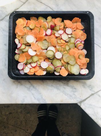 Los vegetales que vamos a usar en esta preparación son tres: zanahorias, rabanitos y unos pepinillos en vinagre que vamos a sumar.