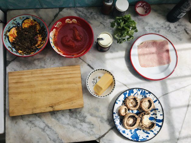 En este caso yo le puse berenjena ahumada de la noche anterior, que la cociné directamente desde la hornalla mezclada con troncos de hongos que corte de cada portobello y que siempre funcionan como parte de un posible relleno de este maravilloso hongo. También agregué, pimentón, comino, tomate al natural, cebolla de verdeo, curry picante, queso y en algunos casos jamón.