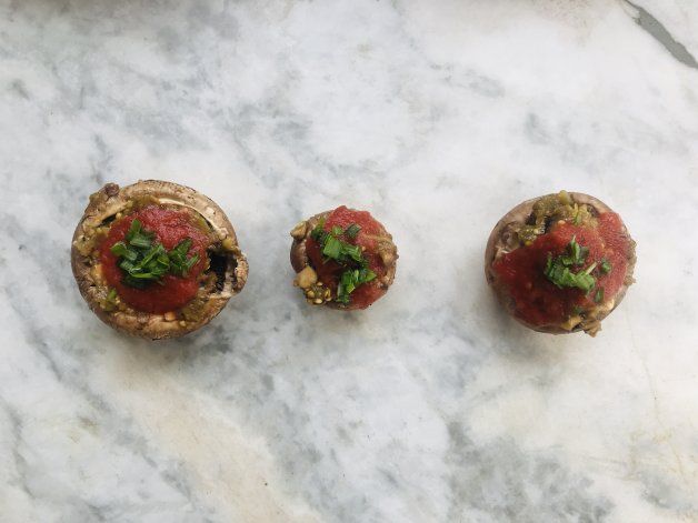 Agarramos el relleno de berenjena ahumada y el tronco de los hongos picado fino y comenzamos a meterlo dentro de la cabeza de los portobellos sin romperlos. Luego agregamos el tomate natural, la cebolla de verdeo cortada chica y rallamos queso encima, el que tengas. En una sartén al fuego agregamos un poco de vino tinto y dejamos que se evapore el alcohol, ponemos los hongos rellenos y tapamos un ratito así el calor cocina parejo. Al sacarlos hay que tener cuidado ya que el vino con el calor termina formando una capa de caramelo que muchas veces los termina pegando.