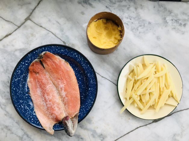 Servir el pescado con las papas fritas. Se lleva bien con cerveza, vino o vermut