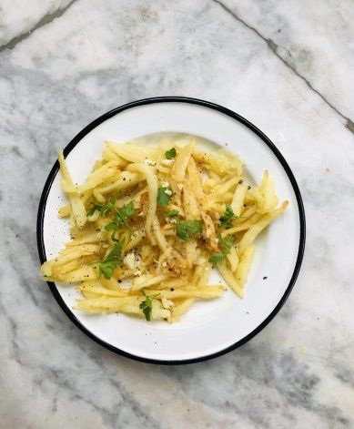 Lavar las papas, pelarlas y cortarlas en bastones.