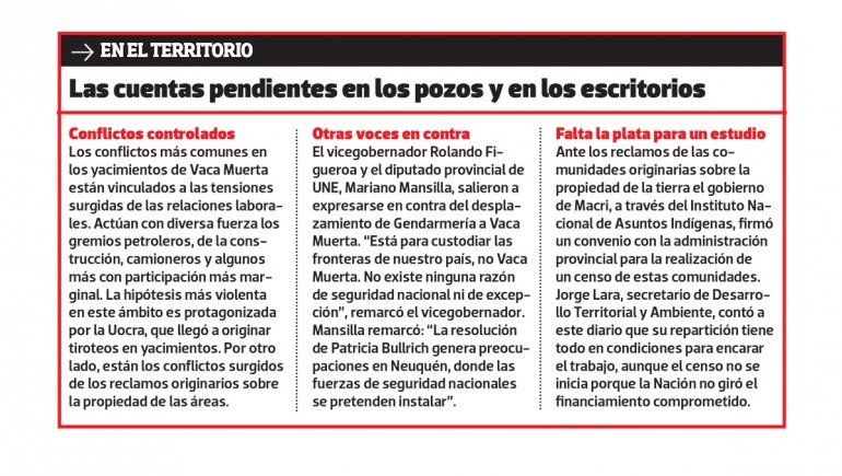 El desplazamiento de la jurisdicción de Gendarmería hasta los yacimientos de Vaca Muerta generó un rechazo generalizado en Neuquén. El gobierno de Mauricio Macri oficializó la habilitación a los centinelas para operar de forma ordinaria en la superficie que guarda uno de los mayores tesoros hidrocarburíferos del mundo.