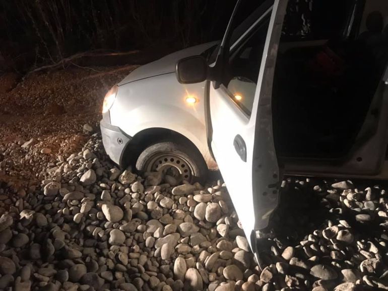 De acuerdo al relato del hombre, viajaba junto a su esposa en una camioneta Renault Kangoo por la Ruta 7 y cuando tomó el acceso a la calle 8 no pudo continuar avanzando ya que quedó encajado entre las piedras dispuestas para utilizar en la obra de ampliación de la calzada que llevan a cabo.