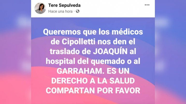 Su familia se expresó muy agradecida con el personal de salud del hospital Pedro Moguillansky que lo está tratando, pero quieren que Joaquín reciba cuidados más intensivos y acceda a la mayor tecnología posible para salvar su vida, en el Hospital del Quemado o el Hospital Garrahan, en Buenos Aires.